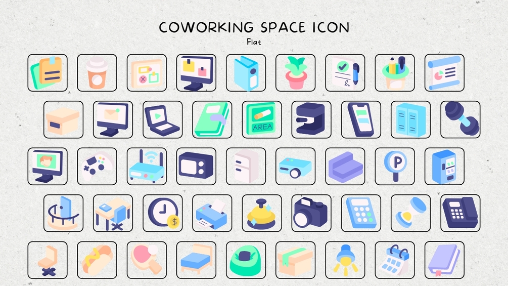 The icons covers Flexibility, community, networking, collaboration, productivity, innovation, startups, entrepreneurs, freelancers, remote work, amenities, office space, hot desking, membership, shared office, events, creativity, conference rooms, professionalism, environment and more.
