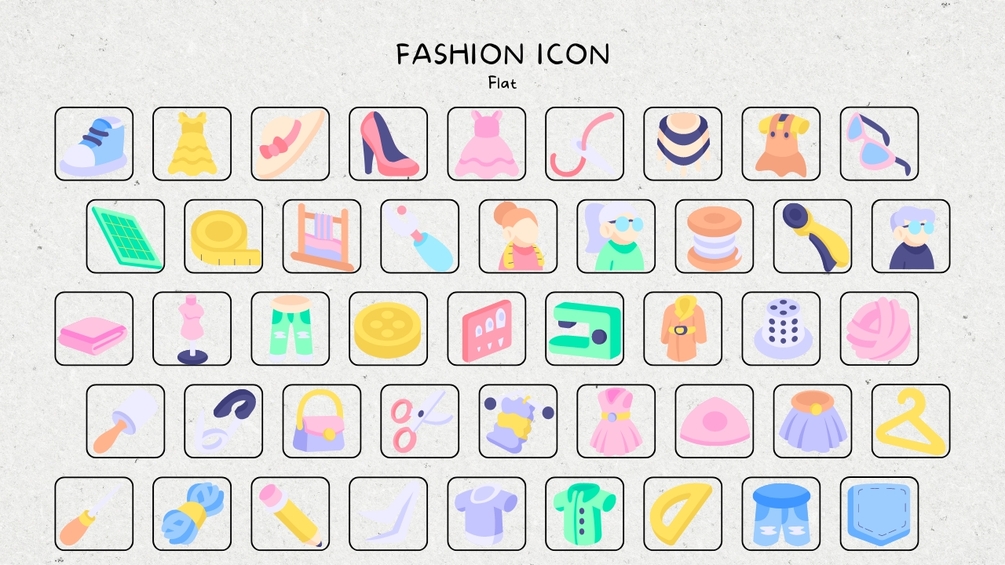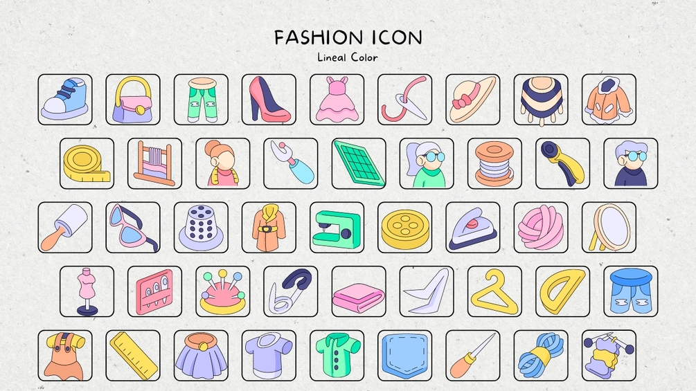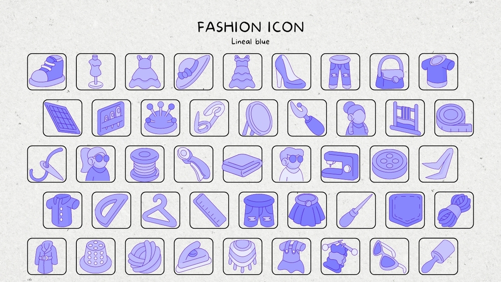 The icons covers Couture, Trends, Textiles, Sketching, Patterns, Garments, Fabrics, Styling, Merchandising, Runway, Accessories, Branding, Collection, Tailoring, Draping and more.